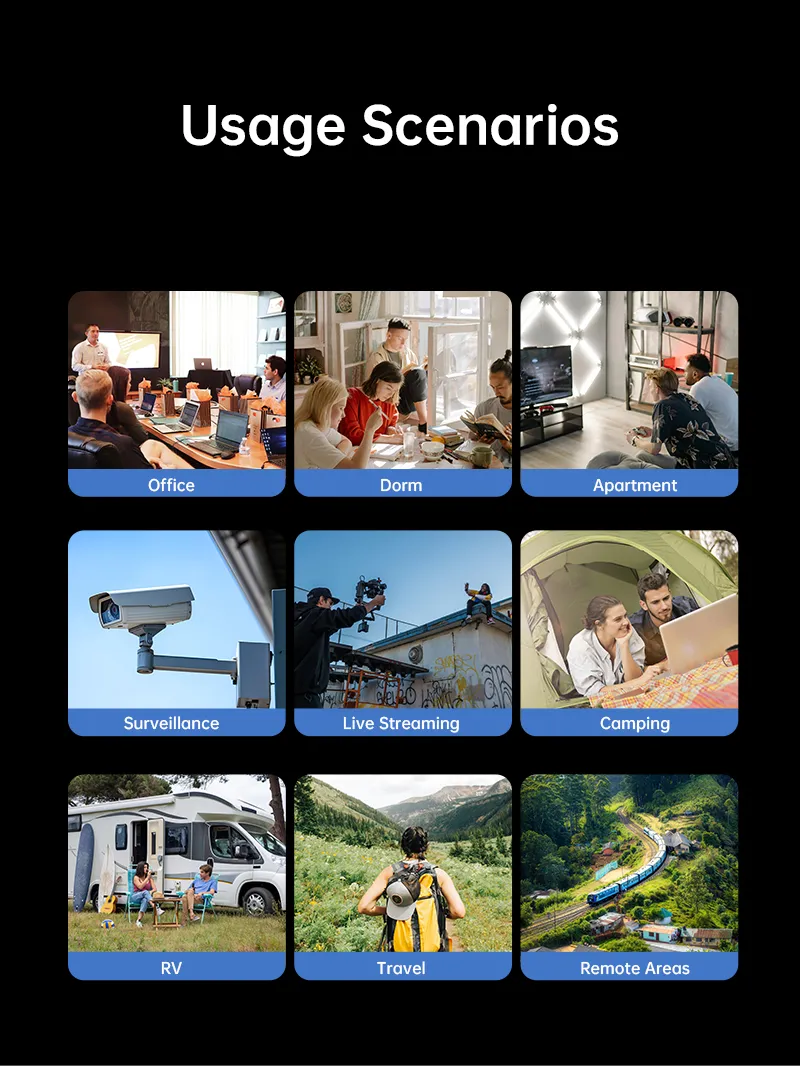 The Plery® R602 4G router is widely used in a variety of scenarios, such as home, office, travel and outdoor